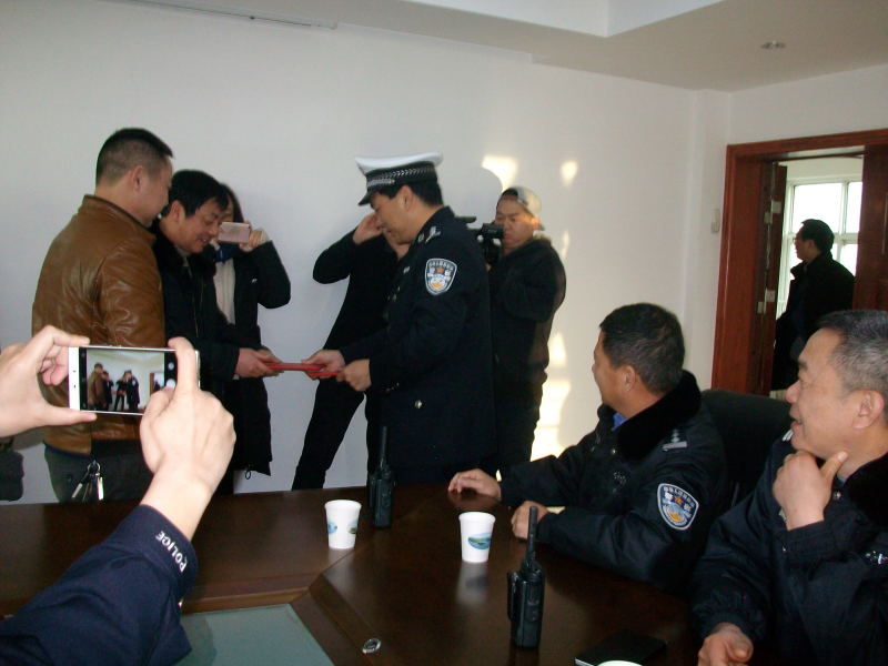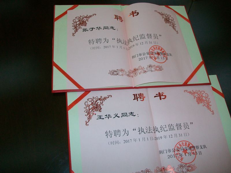 交警在對他們進(jìn)行獎(jiǎng)勵(lì)外,并給他們頒發(fā)了荊門交警支隊(duì)執(zhí)法執(zhí)紀(jì)監(jiān)督員聘書。