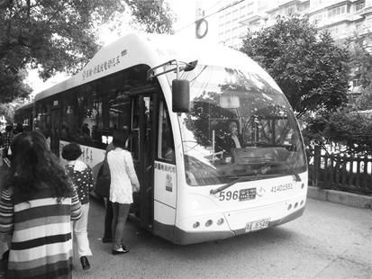 昨日,記者來(lái)到卓刀泉南路方家嘴公交車站,這里是596路的起點(diǎn)站。15分鐘后,一輛漂亮的新能源白色公交車開進(jìn)了站點(diǎn)(如右圖)。這輛公交車外觀和普通公交明顯不同,車身以白色為主,前車窗占整個(gè)車頭前面的一半,車廂兩側(cè)的車窗也占車身高度的一半,從外觀上看,比普通公交車要大得多。
