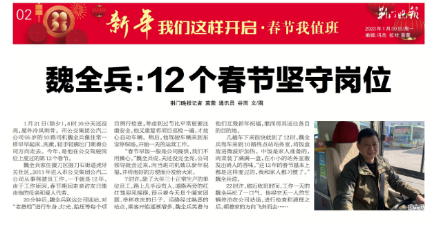 1月30日,荊門(mén)晚報(bào)頭條報(bào)道了市公交集團(tuán)10路線駕駛員魏全兵連續(xù)十二年春節(jié)堅(jiān)守崗位,受到廣大市民朋友們紛紛點(diǎn)贊。