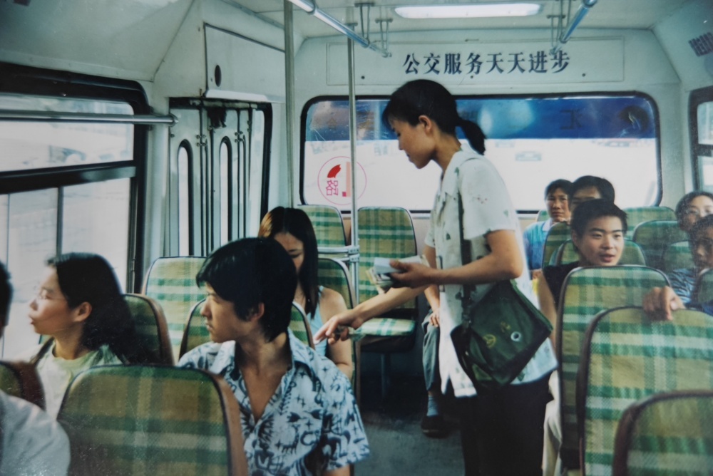 ▲90年代,公交售票員工作模樣。挎著票包,手中拿著零錢和車票,收錢、找錢、給票、查票行云流水。高峰期數十人上下車,想要收好票款,無疑是一種考驗,而她們久經考驗。