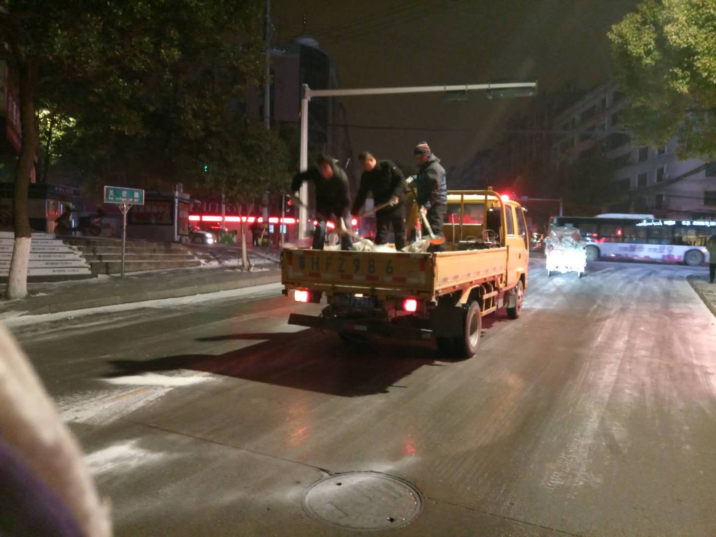 以雪為令!荊門(mén)公交人凌晨4點(diǎn)撒鹽除冰 確保市民平安出行