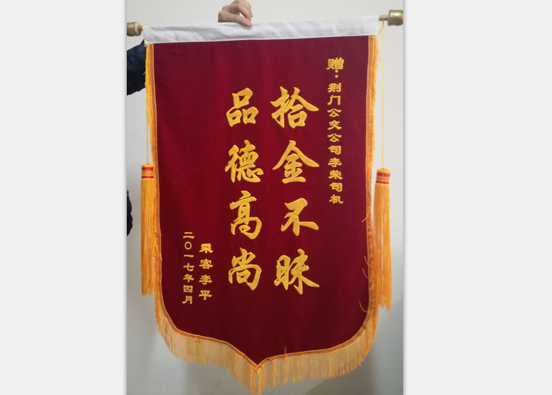 2017年4月4日上午九點(diǎn)左右,一名乘客由于粗心大意,不慎將一個(gè)包包遺留在公交車內(nèi),包包內(nèi)裝有蘋果平板電腦一個(gè)、手機(jī)一部、金銀手飾一包、銀行卡數(shù)張、身份證、現(xiàn)金若干.......二公司三路車159#駕駛員李榮在到達(dá)運(yùn)動(dòng)公園始發(fā)站打掃衛(wèi)生時(shí)發(fā)現(xiàn)了一個(gè)紅色包包,該駕駛員立馬與隊(duì)長取得聯(lián)系、剛好隊(duì)長和站務(wù)在始發(fā)站,駕駛員李榮親自將包交給了隊(duì)長,并說明原由,并在眾人下隊(duì)長打開了包包,發(fā)現(xiàn)里面的都是貴重物品。不久,失主打包內(nèi)的電話來詢問此事,隊(duì)長認(rèn)真做了回復(fù),告之為保證物品安全,要攜帶證明按程序認(rèn)領(lǐng)。當(dāng)天下午失主李女土從公司支部書記手中認(rèn)領(lǐng)失物。昨日送來錦旗一面。
