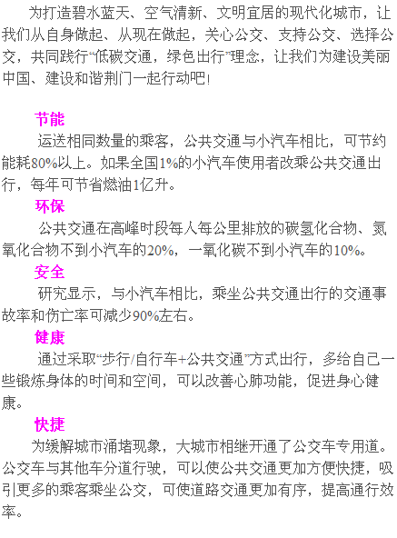 為深入推進(jìn)城市公共交通優(yōu)先發(fā)展,提高城市公共交通服務(wù)水平,加強(qiáng)城市公共交通出行的宣傳和引導(dǎo),自2013年起,交通運(yùn)輸部將每年的9月16日至22日確定為"公交出行宣傳周";。荊門公交集團(tuán)公司成立41年來,共開辟公交線路22條,擁有484臺(tái)公交車,日客運(yùn)量約22萬人次,發(fā)展迅速。但相比國(guó)內(nèi)部分發(fā)達(dá)城市,目前,我市公共交通發(fā)展仍然相對(duì)滯后,與自駕車等個(gè)人交通方式相比,在舒適性、便捷性方面競(jìng)爭(zhēng)力也不足,并且,老百姓優(yōu)先選擇公交出行的認(rèn)識(shí)仍需加強(qiáng)。此次宣傳周活動(dòng)中,荊門公交集團(tuán)公司除了組織員工走上街頭開展集中宣傳活動(dòng),重點(diǎn)宣傳公交車乘車須知、公交IC卡辦理須知等公交常識(shí),現(xiàn)場(chǎng)接受市民咨詢外,還將進(jìn)社區(qū)、進(jìn)學(xué)校開展辦理公交卡等各項(xiàng)便民活動(dòng)。此外,1路公交線各運(yùn)營(yíng)車輛也將通過車載電視滾動(dòng)宣傳城市公共交通對(duì)保障民生、推進(jìn)節(jié)能減排、減少空氣污染、緩解城市交通擁堵的重要意義,積極引導(dǎo)群眾支持和參與城市公共交通發(fā)展。
