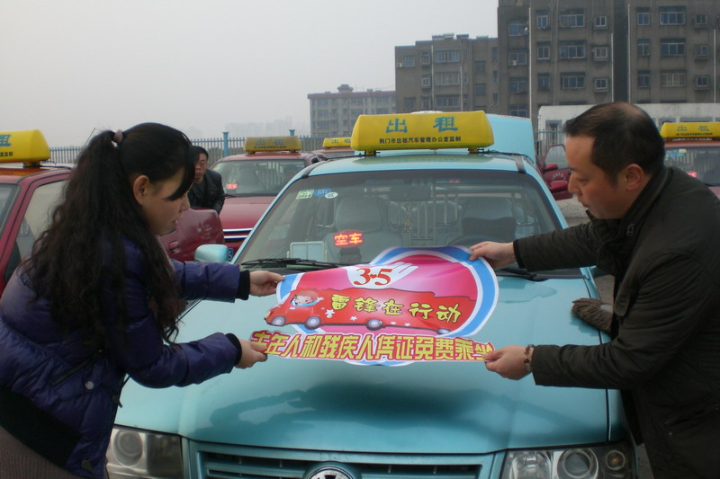 昨日7時30分,市出租汽車公司雷鋒車隊的20臺雷鋒車和20臺優(yōu)秀出租汽車匯集到泉口一路市出租汽車公司院內(nèi),統(tǒng)一粘貼心形的"3-5雷鋒在行動""老年人和殘疾人免費乘坐"活動標(biāo)識(如圖),經(jīng)過簡短的啟動儀式后,駕駛員們整裝出發(fā),在城區(qū)運行,對老年人、殘疾人和到醫(yī)院就醫(yī)但行動不便的病人實行免費接送服務(wù)。